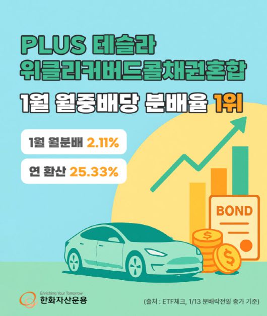 [이데일리 김경은 기자] 한화자산운용은 ‘PLUS 테슬라위클리커버드콜채권혼합’ 상장지수펀드(ETF)가 1월 분배금으로 주당 212원을 지급한다고 19일 밝혔다.