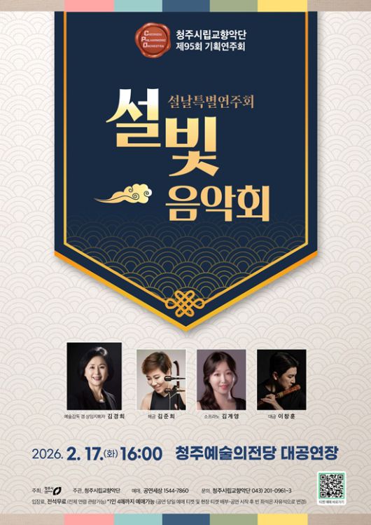 (청주=국제뉴스) 이인영 기자 = 청주시립교향악단이 오는 2월17일 오후 4시 청주예술의전당 대공연장에서 제95회 기획연주 '명절특별연주회–설빛 음악회'를 연다.