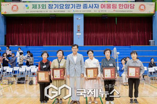 ‘양천구 장기요양기관 종사자 어울림 행사’에서 우수종사자 표창 후 기념촬영 중인 이기재구청장 [사진제공=양천구청] |
