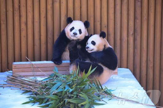 눈 덮인 '판다 세컨하우스'에서 즐거운 시간을 보내는 루이바오(왼쪽)와 후이바오(에버랜드 제공) |