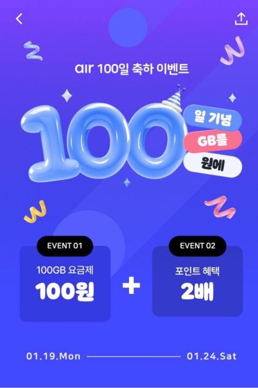SKT는 에어 출시 100일이 되는 19일부터 24일까지 신규 가입자를 대상으로 파격 포인트를 지급하는 '100일 100GB를 100원에' 이벤트를 진행한다고 19일 밝혔다.