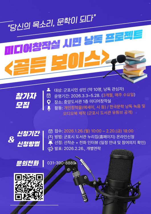 참여 신청은 오는 1월 26일부터 2월 20일까지 군포시 도서관 누리집을 통해 온라인으로 접수하며 선정된 참여자들은 단체 소통 채널을 개설해 약 3개월간 낭독 녹음 활동을 진행한다. 완성된 낭독 결과물은 오디오북으로 제작되어 도서관 공식 유튜브 채널을 통해 시민들에게 공개된다.