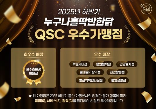 QSC 우수매장 제도는 전국 가맹점의 운영 상태를 정기적으로 점검하는 동시에, 표준화된 운영 기준을 현장에 안착시키고, 매뉴얼을 성실히 준수하는 가맹점주의 사기를 진작하고자 2025년에 신설됐다. 작년 상반기 평가에 이어 이번이 두 번째 시행으로, 인증의 신뢰성을 유지하고자 최상위 3% 매장만을 선정하고 있다.