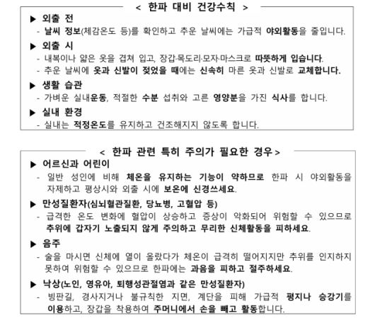 질병관리청은 2013년부터 전국 512개 응급의료기관을 대상으로 ‘한랭질환 응급실 감시체계’를 운영하며 매년 12월부터 이듬해 2월까지 한파로 인한 건강 피해를 상시 모니터링하고 있다. 저체온증, 동상, 동창 등 한랭질환 환자와 추정 사망 사례를 일별로 집계해 공개하는 방식이다.