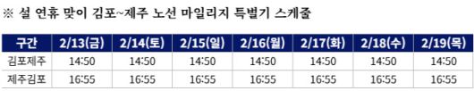 이번 마일리지 특별기는 연휴가 시작되는 2월 13일부터 7일간 매일 2편씩 총 14편 운영한다. 김포~제주 노선 특정 시간대에 마일리지로 우선 발권이 가능하도록 마련됐다.