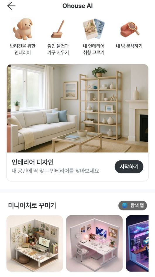 3D 방꾸미기는 방 크기와 구조를 직접 설정한 뒤 실제 제품을 반영한 3D 모델을 둘 수 있는 서비스다. AI 방꾸미기를 이용하면 유저가 올린 집 사진에 맞춰 생성형 AI가 다양한 디자인 및 제품을 제안해 준다. 정교한 공간 계획에 적합한 3D 인테리어는 실제 집 도면을 불러와 3D 모델을 배치할 수 있다.