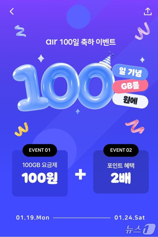 SKT는 이달 24일까지 에어 신규 가입자를 대상으로 '100일 100GB를 100원에' 이벤트를 실시한다.