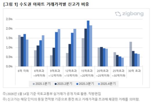 경기도는 하반기로 갈수록 거래 가격대와 신고가 구간이 함께 상향됐다. 4분기 기준 9억원 초과~12억원 이하 신고가 비중은 1.5%, 12억원 초과~15억원 이하는 1.0%로 높아졌다.