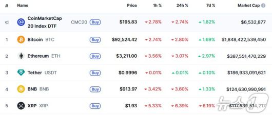 이 시각 현재 주요 암호화폐 시황 - 코인마켓캡 갈무리 |