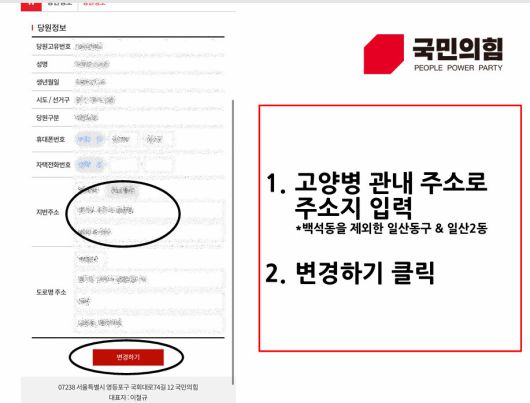 신천지 전 신도인 ㄱ씨는 2026년 1월18일 한겨레에 “2023년 말 신천지 쪽으로부터 신도들을 국민의힘 신규 당원으로 가입시키라는 지시를 받았고, 기존 당원은 (당원 정보 주소를) 경기 고양시로 변경하라는 요구를 받았다”고 밝혔다. ㄱ씨가 2023년 12월30일 교단 쪽으로부터 받은 텔레그램 메시지를 보면, 신천지는 “지역별 목표 수만큼 (국민의힘) 가입 및 주소 변경”을 지시하면서 회원 가입 시 주소를 ‘경기 고양갑 및 고양병 지역’으로 설정하라고 했다. 이미 국민의힘에 당원으로 가입한 신도들에겐 당원 정보 변경 방법을 소개하면서, 주소지를 ‘고양병’으로 바꾸라는 안내가 담긴 첨부 파일을 공유하기도 했다. 이 메시지에선 신규 가입 및 주소 변경자 목표 수치를 ‘교역자 20명, 장년회 40명, 부녀회 200명, 청년회 250명’ 등으로 명시했다. 정당법에선 본인의 승낙 없이 정당 가입 또는 탈당을 강요해선 안 되고 이를 어길 경우 2년 이하의 징역 또는 200만원 이하의 벌금에 처한다고 규정한다. 서울과 경기 북부를 관할하는 시몬지파에서 활동한 ㄱ씨는 청년 신도 10명 정도를 이끄는 ‘구역장’으로 활도동했는데 2025년 신천지를 탈퇴했다.