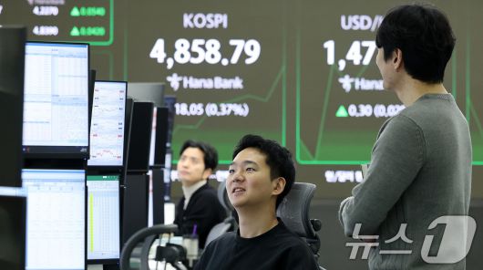 (서울=뉴스1) 박지혜 기자 = 하락 출발했던 코스피가 장 초반 상승 전환한 19일 서울 중구 하나은행 본점 딜링룸 전광판에 코스피 지수가 나타나고 있다. 이날 코스피는 장중 4858.79까지 올라 신고가를 경신하기도 했다. 2026.1.19/뉴스1pjh2580@news1.krCopyright ⓒ 뉴스1. All rights reserved. 무단 전재 및 재배포, AI학습 이용 금지.