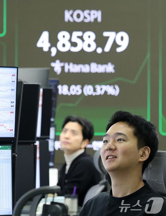 (서울=뉴스1) 박지혜 기자 = 하락 출발했던 코스피가 장 초반 상승 전환한 19일 서울 중구 하나은행 본점 딜링룸 전광판에 코스피 지수가 나타나고 있다. 이날 코스피는 장중 4858.79까지 올라 신고가를 경신하기도 했다. 2026.1.19/뉴스1