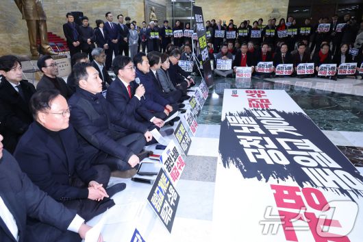 (서울=뉴스1) 신웅수 기자 = 송언석 국민의힘 원내대표가 19일 서울 여의도 국회 로텐더홀에서 열린 최고위원회의에서 발언하고 있다. 2026.1.19/뉴스1
