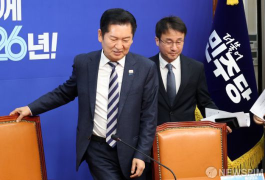 [서울=뉴스핌] 정일구 기자 = 정청래 더불어민주당 대표와 한병도 원내대표가 19일 오전 서울 여의도 국회에서 열린 더불어민주당 최고위원회의에 참석하고 있다. 2026.01.19 mironj19@newspim.com
