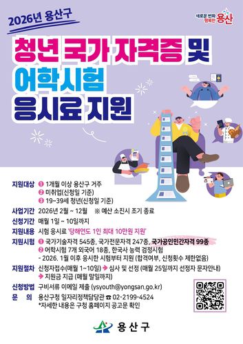 지원신청은 매월 1일부터 10일까지 전자우편(ysyouth@yongsan.go.kr)으로 할 수 있다. 서류 검토 후 매월 25일까지 지원 대상자를 선정하고 매월 말 개별 계좌로 응시료 실비를 지급할 예정이다. 예산 소진 시 사업은 조기종료될 수 있다.