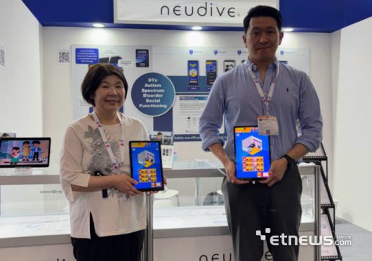 세계 최대 의료기기 박람회 'MEDICA 2025' 현장에서 뉴다이브 조성자 대표(왼쪽)와 한국뇌연구원 정민영 선임연구원(오른쪽)이 자폐스펙트럼장애(ASD) 디지털 인지행동 치료기기를 선보이고 있다 |