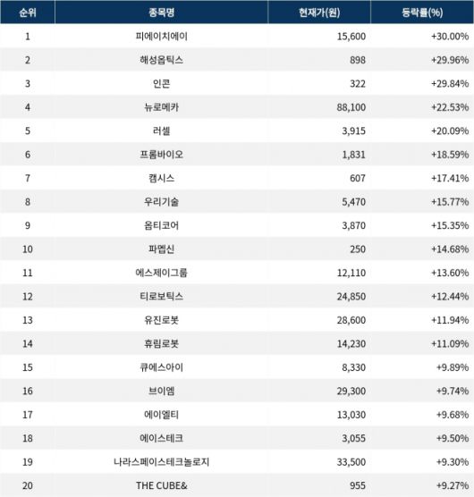 6위 프롬바이오(377220)는 현재가 1831원으로 +18.59% 상승 중이다. 7위 캠시스(050110)는 현재가 607원으로 +17.41% 상승 중이다. 8위 우리기술(032820)은 현재가 5470원으로 +15.77% 상승 중이다. 9위 옵티코어(380540)는 현재가 3870원으로 +15.35% 상승 중이다. 10위 파멥신(208340)은 현재가 250원으로 +14.68% 상승 중이다.