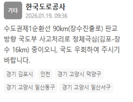 한국도로공사는 19일 오전 9시 36분께 "수도권제1순환선 90km(장수진출로) 판교 방향 국도부 사고 처리(김포-장수 16km)로 정체가 극심하다"는 내용이 담긴 재난문자를 발송했다.
