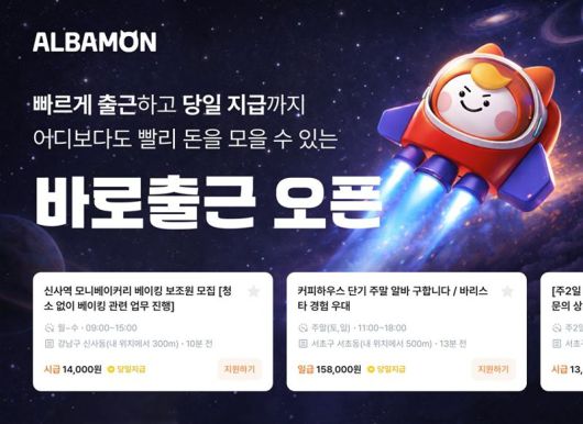 [파이낸셜뉴스] 아르바이트 플랫폼 알바몬이 빠른 출근을 원하는 구직자와 사장님을 연결하는 '바로출근 채용관'을 운영한다고 19일 밝혔다.