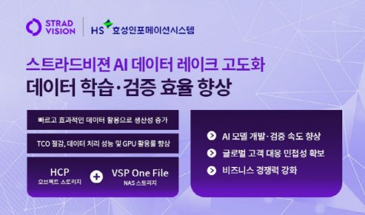 19일 HS효성인포메이션시스템은 스트라드비젼의 AI 데이터 파이프라인을 고도화하는 인프라 구축을 완료했다고 밝혔다. 전 세계 고객사 차량에서 생성되는 주행 데이터를 활용해 AI 모델을 학습하고 검증하는 업무 특성을 반영해 설계했다.