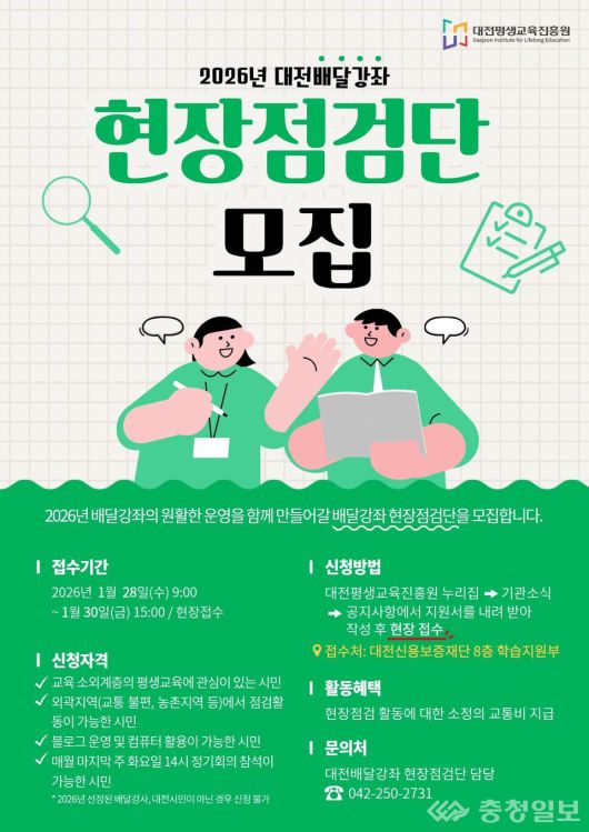 대전평생교육진흥원은 30일까지 대전배달강좌 현장점검단을 모집한다. 점검단은 실제 강좌가 진행되는 교육 장소를 직접 방문해 운영 상황을 확인하고, 우수 사례를 발굴해 공유하는 역할을 맡는다. 활동에 참여하면 교통비가 지급되며, 봉사활동 시간도 인정된다.