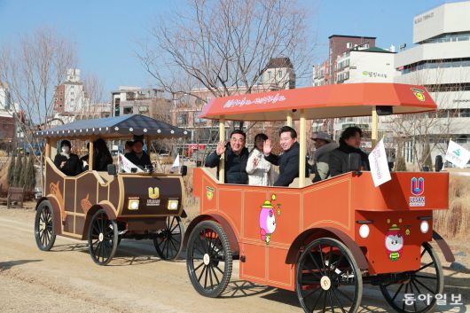 김두겸 울산시장과 시민들이 14일 태화강 국가정원에서 열린 ‘울산 마차’ 시승회에 참석해 손을 흔들고 있다. 말 대신 전기로 움직이는 이 마차는 태화강 국가정원과 울산대공원에서 관광 콘텐츠로 운영될 예정이다. 울산시 제공 |