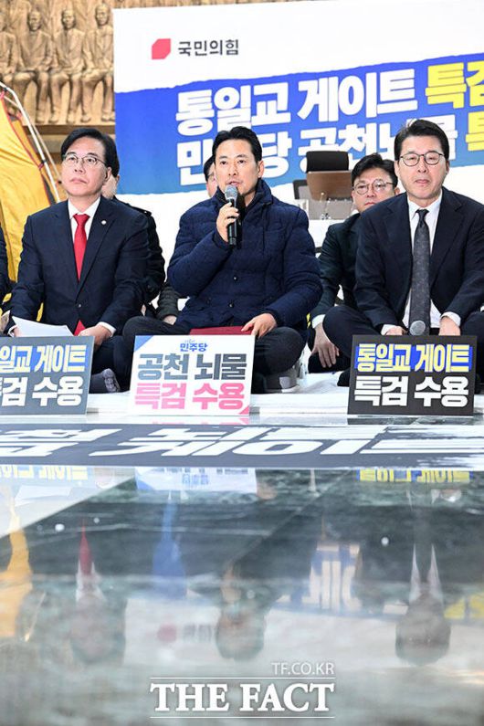 [더팩트ㅣ국회=남용희 기자] 장동혁 국민의힘 대표(가운데)가 19일 오전 서울 여의도 국회 로텐더홀에서 열린 최고위원회의에서 발언을 하고 있다.