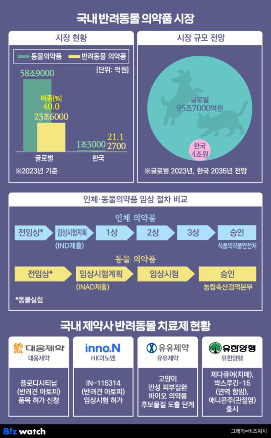 국내 반려동물 의약품 시장은 아직 초기 단계다. 한국동물약품협회에 따르면 2023년 기준 국내 동물용의약품 시장 규모는 약 1조3000억원으로, 연평균 2~5% 성장해왔다. 이 중 반려동물 의약품은 2024년 기준 2896억원 규모로, 전체 동물의약품 시장의 21.1%에 불과해 성장 가능성이 큰 것으로 평가된다.