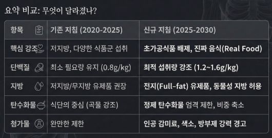또한, 한국 사회 역시 서구화된 식습관이 보편화됨에 따라 비만과 만성질환 유병률이 상승하는 추세다. 이에 미국의 국가적 결단을 '타산지석(他山之石)' 삼아 우리의 식탁을 선제적으로 점검하기 위해, 개정된 미국 정부의 식이 지침을 면밀히 살펴볼 필요가 있다.