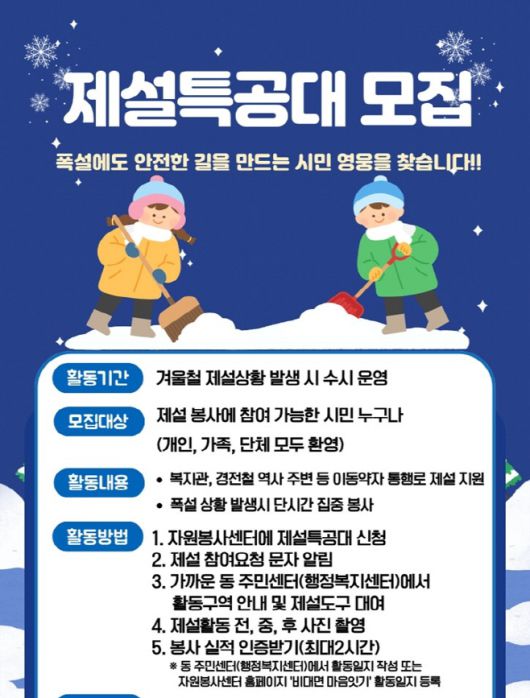제설특공대는 폭설 시 복지관, 경전철 역사 주변 등 시민 통행이 많은 지역을 중심으로 제설 활동을 펼치는 시민 봉사단이다. 개인은 물론 가족 단위나 단체 등 누구나 참여할 수 있어 시민 참여를 통한 지역안전 강화가 기대된다.