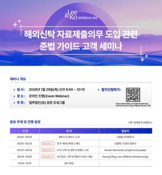광장 조세그룹은 "이번 세미나가 해외신탁에 관한 최신 글로벌 트렌드를 확인하고 자산 관리 전략을 점검할 수 있는 유익한 자리가 되기를 바란다"며 "많은 관심과 참여를 부탁드린다"고 말했다.