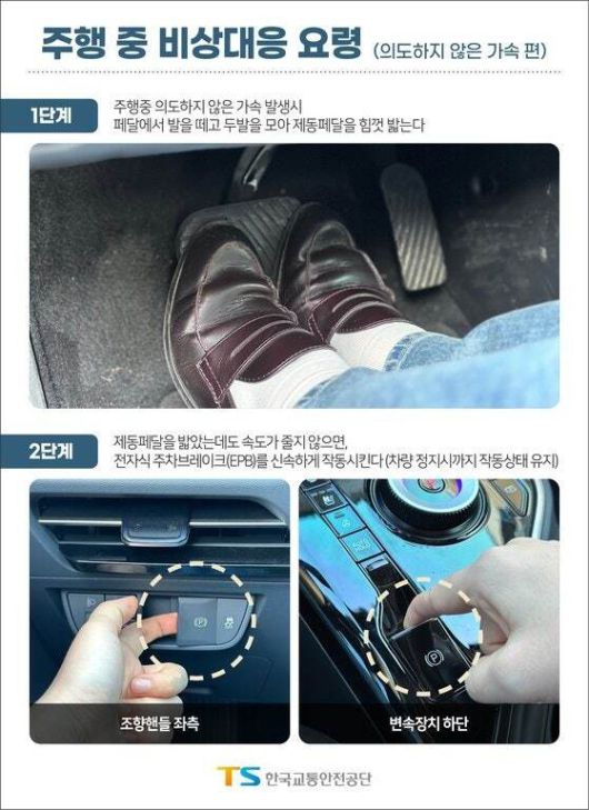 교통안전공단은 페달 오조작 사고와 같이 의도하지 않은 가속으로 인한 사고를 예방하기 위해 주행 중 의도하지 않은 가속이 발생하면 두 발을 모아 제동 페달을 힘껏 밟고, 작동하지 않는다면 전자식 주차브레이크(EPB)를 찾아 누르라고 안내했다.