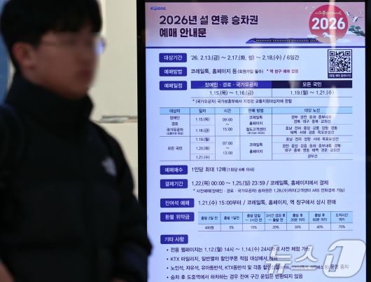 (서울=뉴스1) 구윤성 기자 = 전국민 대상 설 연휴 열차 승차권 일반예매가 시작된 19일 서울역 승차권 판매창구 앞에 관련 안내문이 게시돼 있다. 2026.1.19/뉴스1