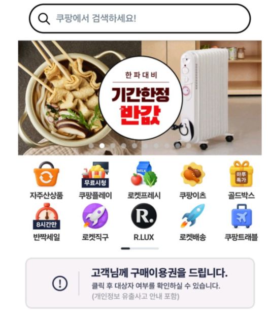 19일 유통가에 따르면 쿠팡은 지난 15일 오전 10시부터 애플리케이션과 PC 화면에 '고객님께 구매이용권을 드립니다'라는 안내문과 함께 구매이용권을 지급했다. 지급 대상 여부를 확인한 고객은 쿠팡의 구매이용권을 다운로드할 수 있다. 세부적으로 보면 쿠팡 전 상품 5000원, 쿠팡이츠 5000원에 쿠팡 트래블 2만원, 알럭스 뷰티·패션 2만원 등 4종이다.