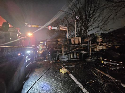 당국은 제1순환선 장수진출로에서 수현삼거리 방향 4차로 도로 중 3개 차로를 막고 현장 정리에 나서고 있는데, 이 여파로 김포TG까지 고속도로 정체가 이어지고 있다.
