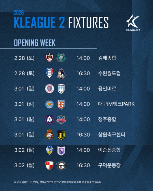2026시즌 K리그2의 문을 여는 첫 번째 경기는 2월 28일 오후 2시 김해종합운동장에서 열리는 김해와 안산의 경기다. 지난해 K3리그 우승팀 김해는 올 시즌 프로 무대에 도전장을 내밀었고, 안산은 지난 시즌 부진을 씻고 중위권 도약을 노린다.