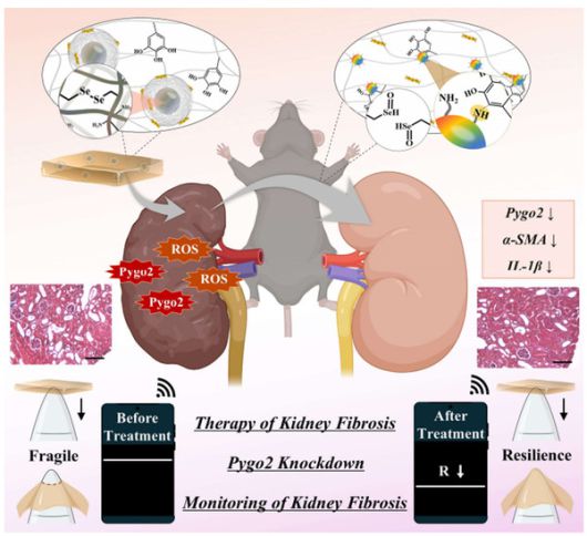 연구팀은 신장 섬유화 부위에서 과도하게 생성되는 활성산소(ROS)에 반응해 물리·화학적 변형이 일어나는 하이드로겔을 설계하고, 여기에 Wnt/β-catenin 신호전달 경로의 핵심 인자인 Pygo2 유전자를 억제하는 shPygo2를 탑재했으며, 해당 하이드로겔은 병변 부위의 산화 스트레스 환경을 감지해 선택적으로 유전자를 방출함으로써 치료 효율을 극대화한다.