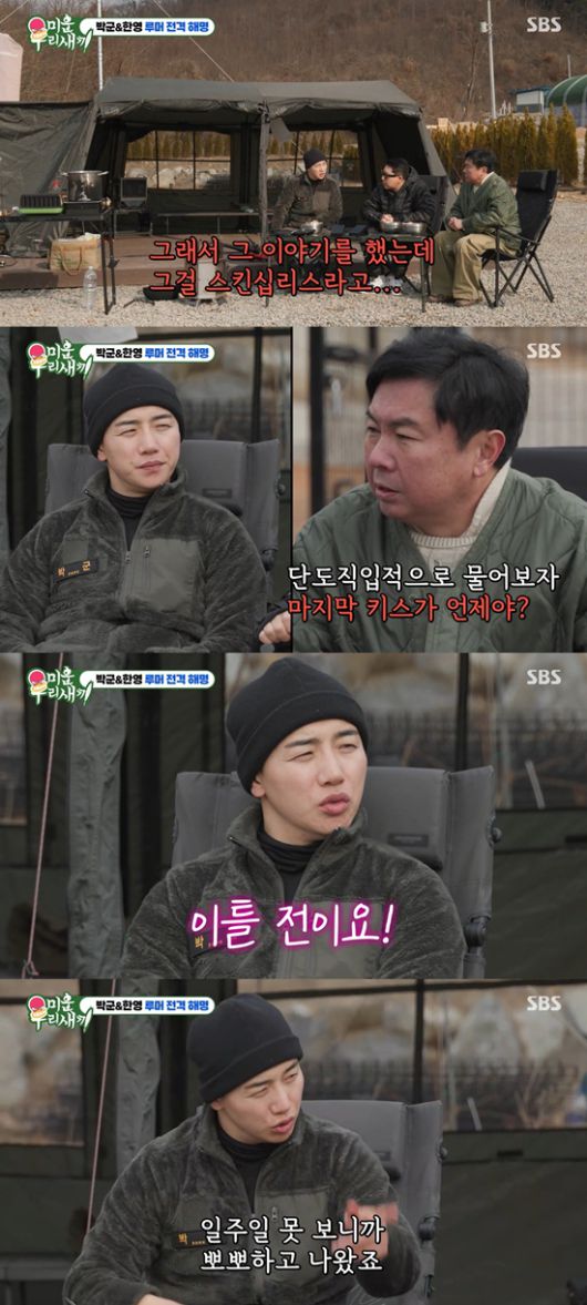 박군은 "라디오 스케줄 때문에 일주일 정도 집을 비우게 됐다. 그래서 나가기 전에 뽀뽀하고 나왔다"며 부부 사이가 여전히 원만함을 자연스럽게 드러냈다.