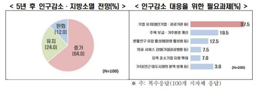 비수도권 지방자치단체 대부분이 인구 감소 대책을 추진하고 있지만, 효과가 크지 않아 향후 5년 내 지방 소멸 위기가 더 고조될 것이라는 지자체 대상 설문조사 결과가 나왔다.