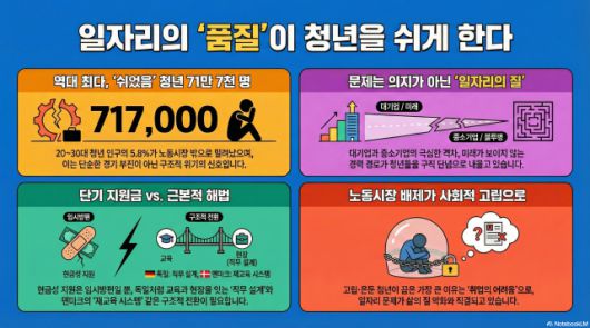 정부는 오는 3월까지 ‘쉬었음’ 청년을 위한 보완 대책을 내놓겠다고 밝혔다. 그러나 또다시 인턴 확대나 지원금 보강 수준에 머문다면 정책 실패를 반복하는 셈이다. 지금 필요한 것은 취업을 독려하는 구호가 아니라, 정부가 직접 책임지고 일자리의 품질과 경로를 재설계하는 일이다. 중소·중견기업에서도 경력을 축적하고 이동할 수 있는 구조, 산업 전환 과정에서 청년이 배제되지 않는 직무 설계가 핵심이다.