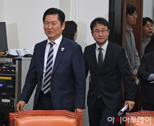 아시아투데이 송의주 기자 = 정청래 더불어민주당 대표와 한병도 원내대표가 19일 국회에서 열린 최고위원회의에 참석하고 있다.