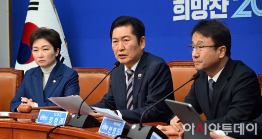 아시아투데이 송의주 기자 = 정청래 더불어민주당 대표(가운데)가 19일 국회에서 열린 최고위원회의에서 발언을 하고 있다.
