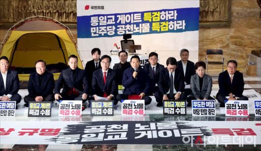 아시아투데이 송의주 기자 = 장동혁 국민의힘 대표가 19일 국회 본관 로텐더홀에서 열린 최고위원회의에서 발언을 하고 있다.
