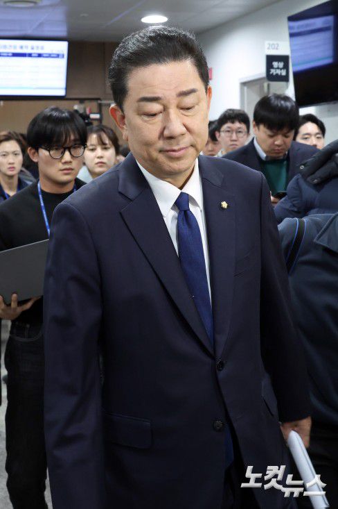 더불어민주당 김병기 전 원내대표가 19일 서울 여의도 국회 소통관에서 당 윤리심판원의 제명 처분 결정 등에 대한 입장 발표 기자회견을 마치고 이동하고 있다.
