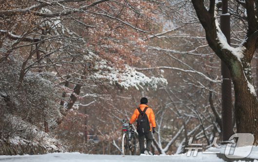 (수원=뉴스1) 김영운 기자 = 간밤에 눈이 내린 19일 경기 수원시 팔달구 팔달산 산책로에서 시민들이 산책을 하고 있다. 2026.1.19/뉴스1kkyu6103@news1.krCopyright ⓒ 뉴스1. All rights reserved. 무단 전재 및 재배포, AI학습 이용 금지.
