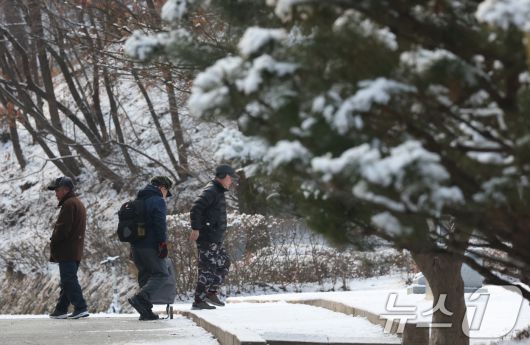 (수원=뉴스1) 김영운 기자 = 간밤에 눈이 내린 19일 경기 수원시 팔달구 팔달산 산책로에서 시민들이 산책을 하고 있다. 2026.1.19/뉴스1