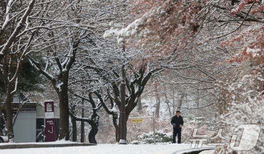 (수원=뉴스1) 김영운 기자 = 간밤에 눈이 내린 19일 경기 수원시 팔달구 팔달산 산책로에서 시민들이 산책을 하고 있다. 2026.1.19/뉴스1kkyu6103@news1.krCopyright ⓒ 뉴스1. All rights reserved. 무단 전재 및 재배포, AI학습 이용 금지.