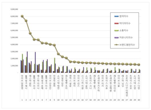 브랜드평판지수는 소비자들의 온라인 행동 빅데이터를 분석해 브랜드에 대한 긍부정 평가, 미디어 관심도, 소비자들의 관심과 소통량을 측정하는 지표다. 걸그룹 개인 브랜드평판 분석에는 브랜드 영향력을 측정한 브랜드 가치평가 분석도 포함됐다.