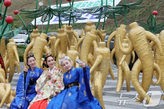 19일 충남 금산세계인삼엑스포광장 일원에서 열린 제43회 금산세계인삼축제에서 방문객들이 인삼 조형물 앞에서 한복을 입고 셀피촬영을 하고 있다. 2025.9.19/뉴스1 ⓒ News1 김기태 기자 |