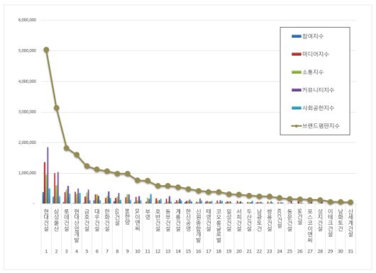 건설회사 브랜드평판 1위를 기록한 현대건설 브랜드는 참여지수 387,264, 미디어지수 1,358,398, 소통지수 953,431, 커뮤니티지수 1,848,643, 사회공헌지수 497,124로 집계되며 브랜드평판지수 5,044,861을 기록했다. 이는 지난 12월 브랜드평판지수 3,707,006과 비교해 36.09% 상승한 수치다.